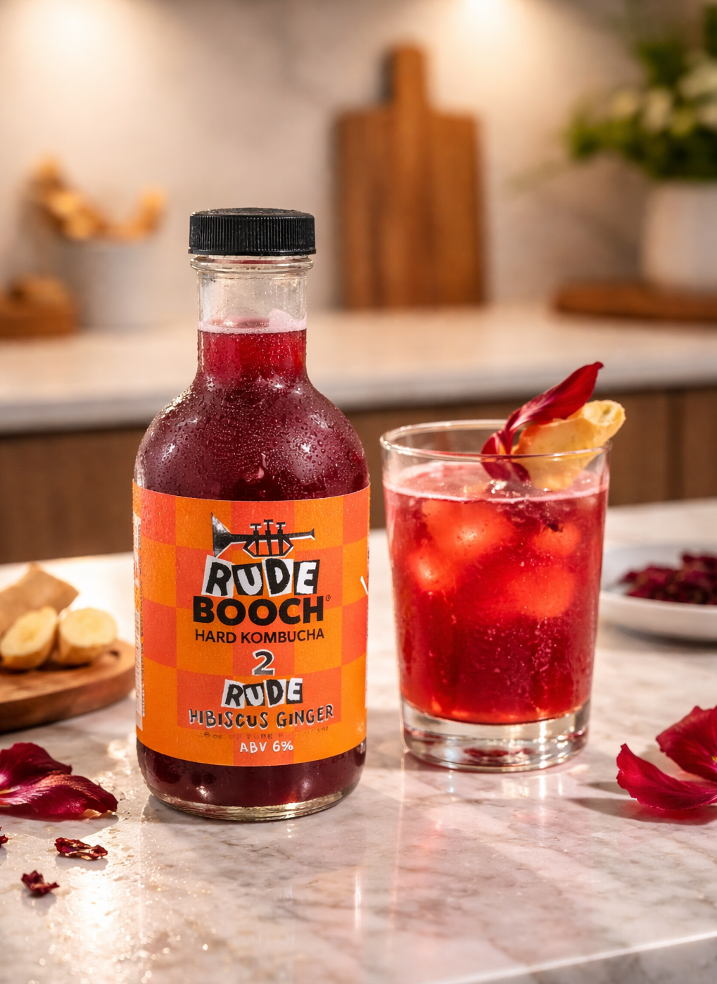 2 Rude to rock your socks off! Our hibiscus ginger kombucha is packed with dried ginger, moringa, root flower, and of course, dried hibiscus flowers to pack a floral punch. A dry, yet flavorful kombucha, it is our rudest flavor yet.